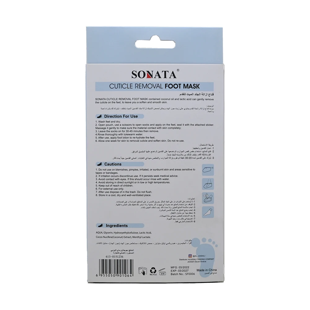حان الوقت لتجربة الحل المثالي لاستعادة نعومة وجمال قدميكِ مع ماسك إزالة الجلد الميت من SONATA! فهو يمنحكِ عناية احترافية من راحة منزلك، ليترك قدميكِ ناعمتين وكأنكِ خرجتِ من جلسة باديكير فاخرة.